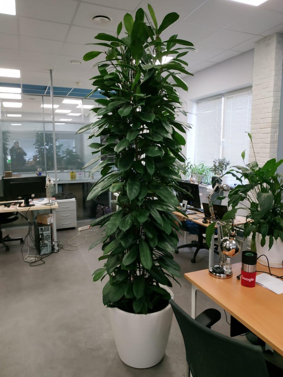 Ответ: Полив, очистка листьев и поддержка декоративности выполняются регулярно: от 1 раза в неделю до 1 раза в месяц в зависимости от вида растения и условий офиса.