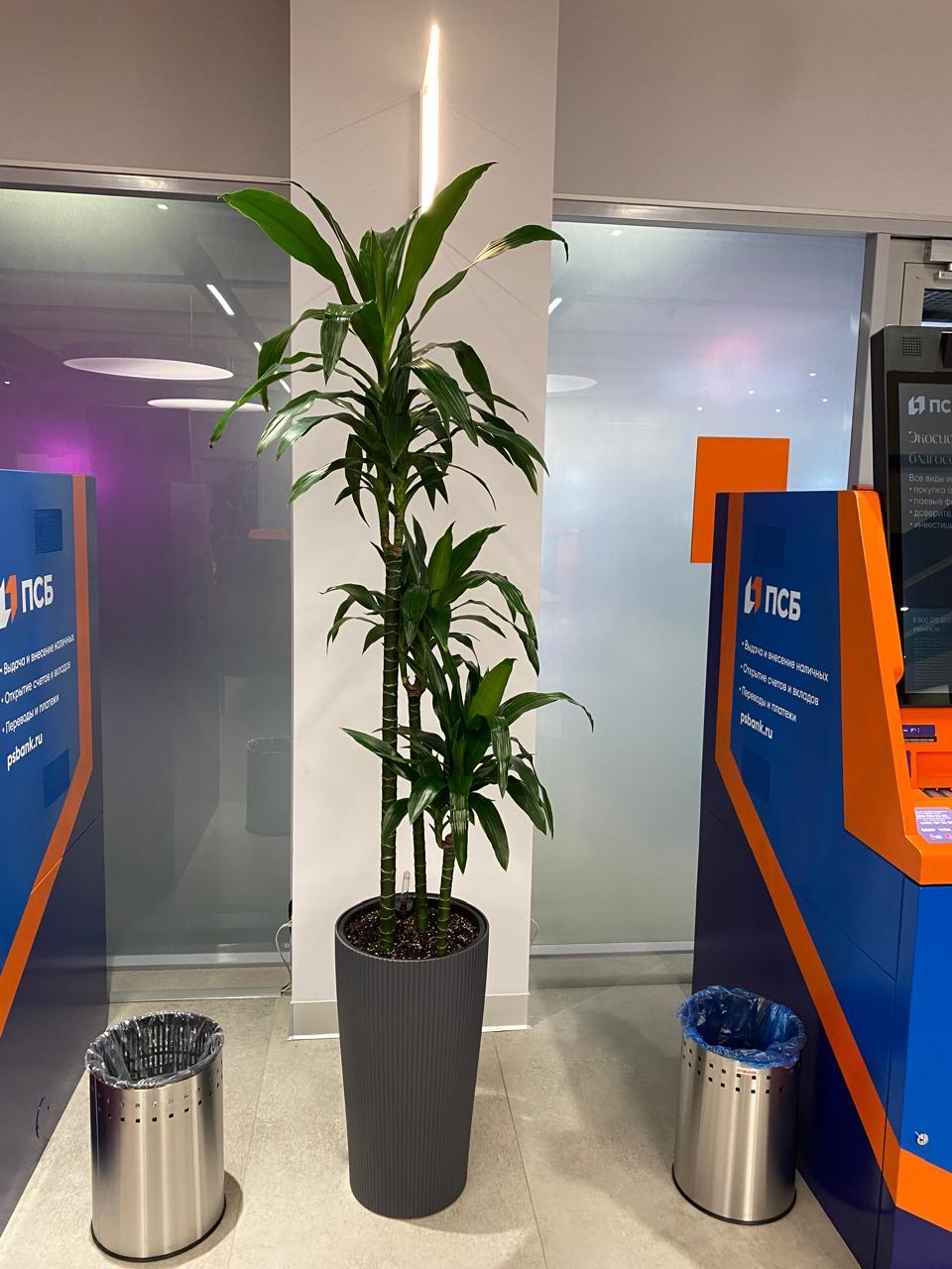 Офис клиента оформлен большими растениями для офиса и дома — фикусы, драцены, пальмы. Без ухода их внешний вид быстро поортится, но с постоянным обслуживанием они сохраняют пышную крону и блеск листьев круглый год.