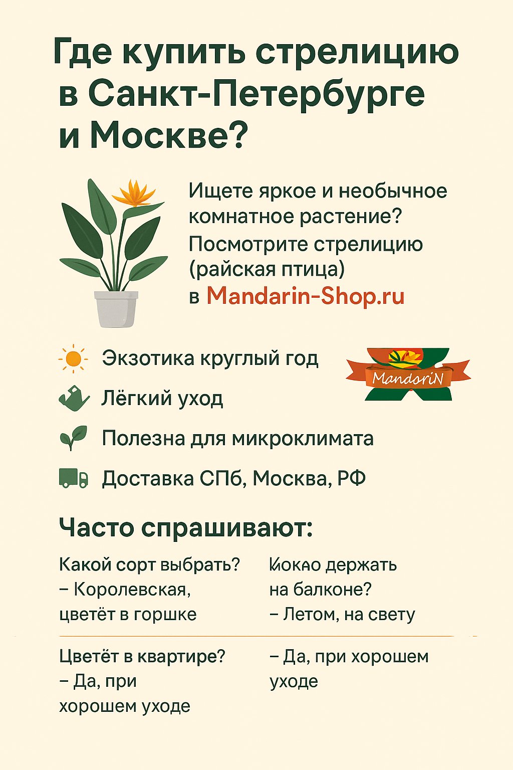 Зайдите в каталог, выберите стрелицию, оформите заказ онлайн или по телефону. Мы поможем с выбором и доставим экзотическое растение к вам домой уже на этой неделе!