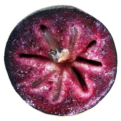 Плоды растения округлые, диаметром от 5 до 10 сантиметров. Тонкая гладкая кожица плодов приобретает бледно-зеленый или красно-фиолетовый оттенок в период созревания. Внутри плода содержится 6-8 темных семян, длина которых достигает 2 см. Чем меньше семечек в "яблоке" - тем вкуснее и сочнее у него мякоть.Спелый плод настолько крепко удерживается на ветке дерева, что его обычно срезают вместе с веткой.