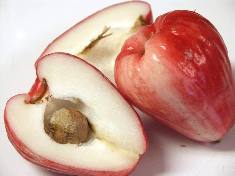 Следует также обратить внимание на наличие и образование впоследствии плодов. Они распространяют тонкий и интенсивный аромат из пряностей, поэтому нередко их используют в кулинарии вместо гвоздики. Ягоды у розового яблока грушевидной формы могут употребляться в пищу. Их поверхность аккуратно покрыта тонкой кожицей желтоватого или розового оттенков.
