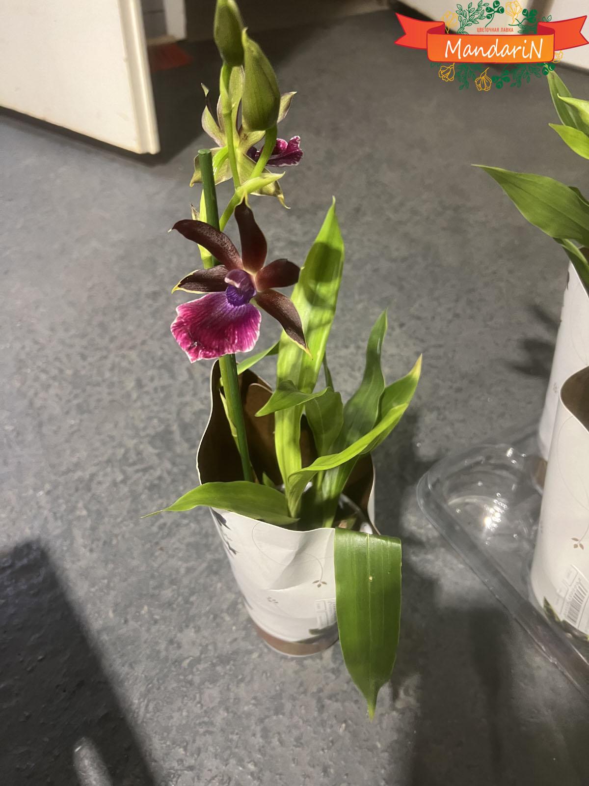 4. «Triste». Цветонос имеет длину 35 см. На каждом из них размещено от 6 до 7 цветочков. Все верхние листики слегка заужены. Они окрашены в коричнево-фиолетовые полосы.