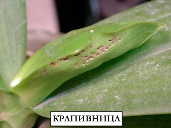 Крапивницей заболевает орхидея, находящаяся в духоте. Когда воздух становится затхлым, он благоприятствует активности вирусов, атакующих орхидею. Растение подхватывает вирусную инфекцию, на нем появляются разнообразные вкрапления.