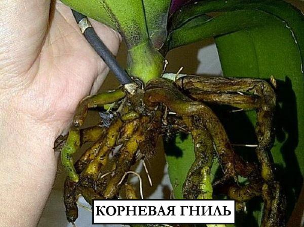 Корневая гниль – очень неприятное заболевание корней Фаленопсиса. Когда вокруг растения тепло и влажно, а поливают его часто и обильно, корни орхидеи загнивают. Болезнь распространяется и на другие части растения, расположенные близко к грунту. Стебли, псевдобульба, листья могут порасти белыми грибами. Цвет розеток листьев меняется на кремово-желтый, другие органы растения могут приобрести коричневый оттенок.