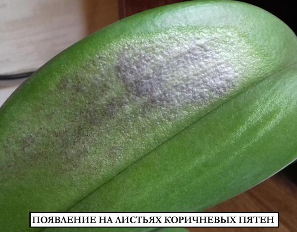 На листике орхидеи появилось коричневое пятно, внешне похожее на ожог. Обнаружив такое пятно, убедитесь, что на цветок не падают солнечные лучи и не обжигают его листья. Заметив это, примите меры к избавлению растения от вредоносных солнечных ванн.