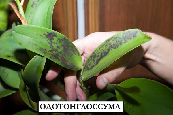 Первый (Одотонглоссума) заражает листья. На них появляются пятна, а сами листья теряют цвет и тургор.