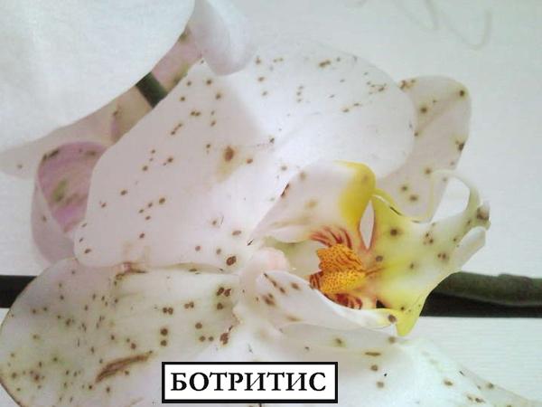 Ботритис – это результат агрессии грибка. Болезнь проявляется и развивается во влажных условиях. Когда цветок опрыскивается и поливается, на нем остаются водяные капельки. Вода задерживается на цветочных лепестках и в пазухах листьев. От этой остаточной влаги цветки красавицы тропиков и её бутоны покрываются пятнышками. Они могут быть светло-коричневого, а могут быть черного цвета.