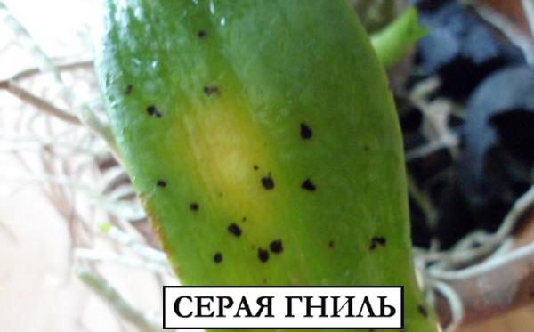 Вместе с цветками страдают и листья орхидеи. Они покрываются пятнами серого цвета, внутри которых наблюдается легко стираемый пепельный налет.