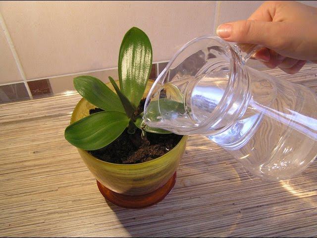 Поливают растение свежеприготовленным раствором из лейки. Полностью смачивают субстрат, затем прекращают полив. Оставляют растение на 15–20 минут. Далее сливают излишки раствора с помощью такого приема: ладонью придерживают орхидею в области корневой шейки, медленно наклоняют, чтобы не впитавшаяся жидкость вытекла из емкости.