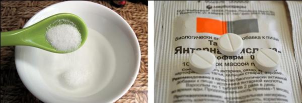 Измельченную янтарную кислоту растворяют в горячей воде, затем разбавляют таким количеством воды для полива растений, чтобы получился требуемый в рецепте объем. При этом, концентрация жидкости для здоровых и увядших растений отличается. Препарат в виде подкормок действует преимущественно на корневую систему, в виде опрыскивания — на листья и побеги.