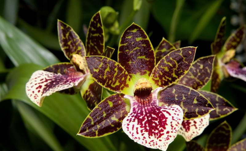 Эпифитная и литофитная орхидея. Соцветия светло-зеленого цвета с коричневыми вкраплениями.